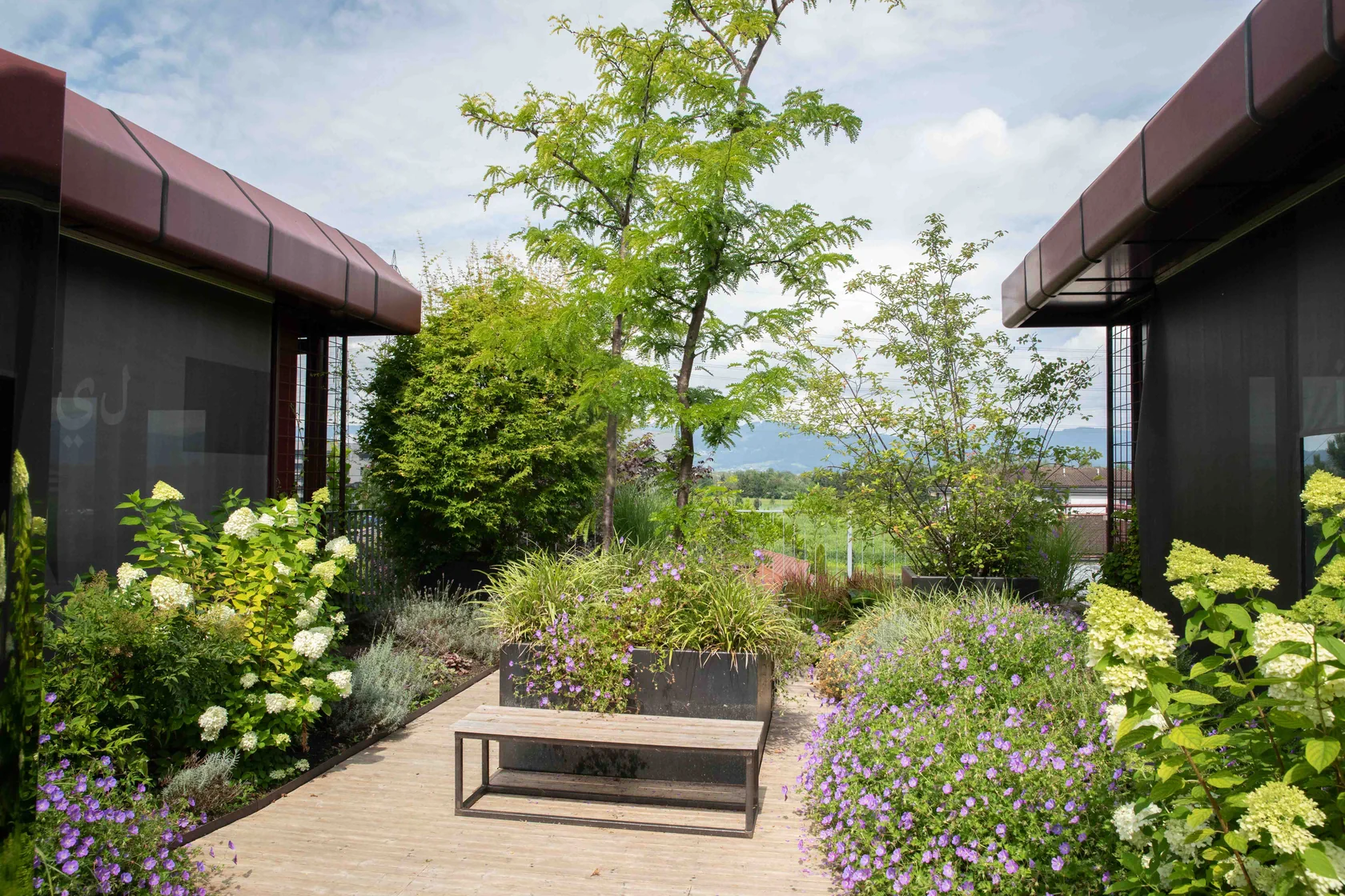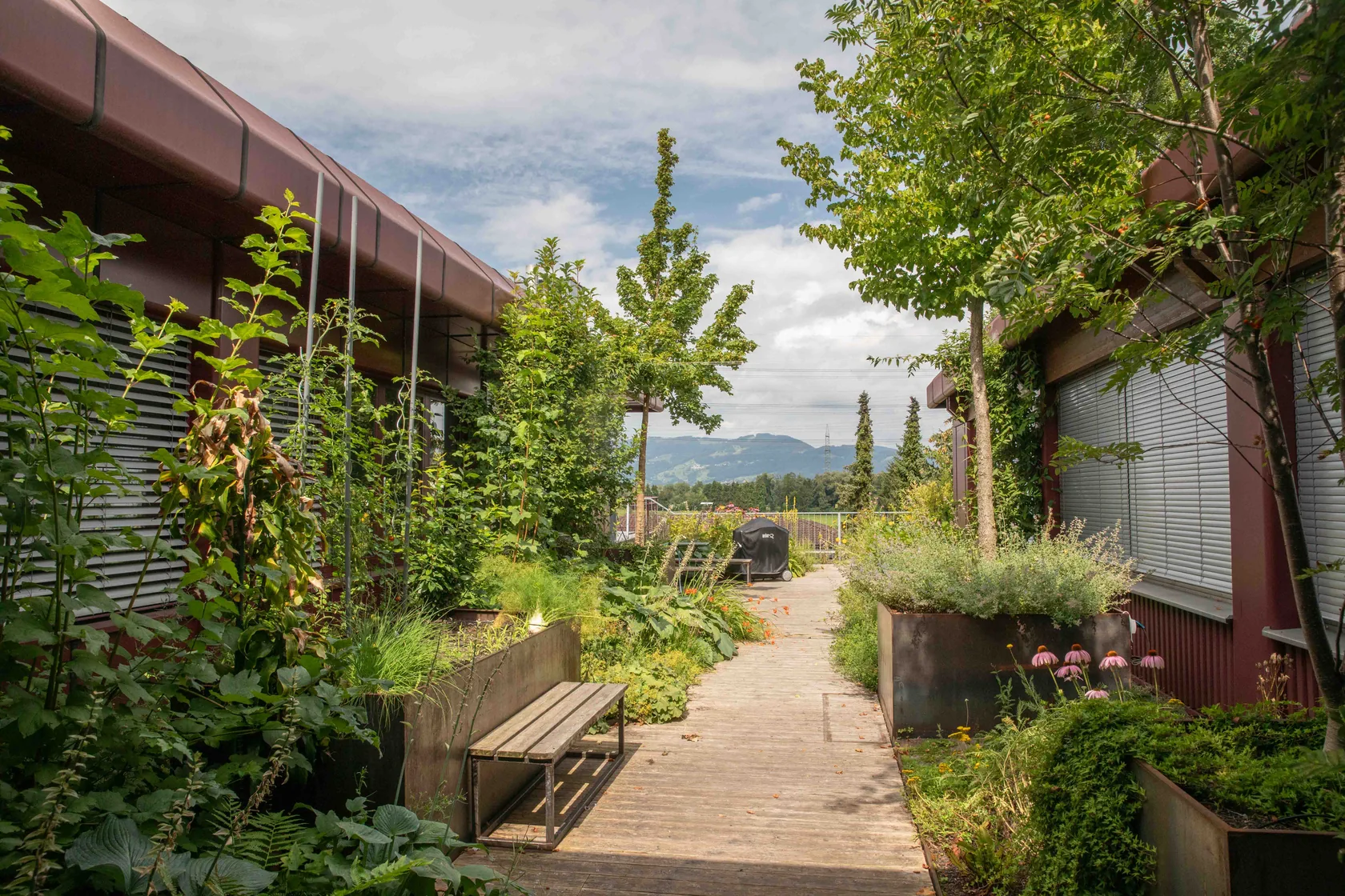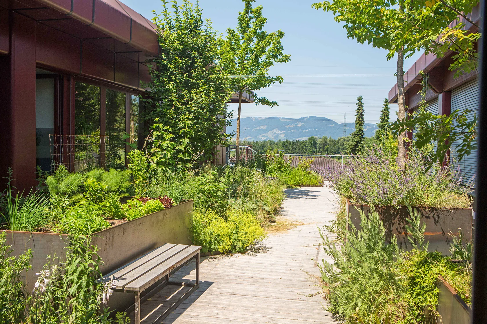 Die Natur-Terrasse wird sehr naturnah angelegt. Mit heimischen Pflanzen, Totholz am Boden, Wildbienenflächen, Farne und Bodendecker, sowie mit Rankpflanzen an Seilbespannungen und verrostenden Baumbehältern. Zwei Hochbeete für die Bepflanzung durch Mitarbeiter. Beschattende Bänke zum Rasten und Erholen laden die Besucher zum Naturgenuss ein. Mit Blick auf die Abendsonne weit drüben über den Schweizer Bergen.