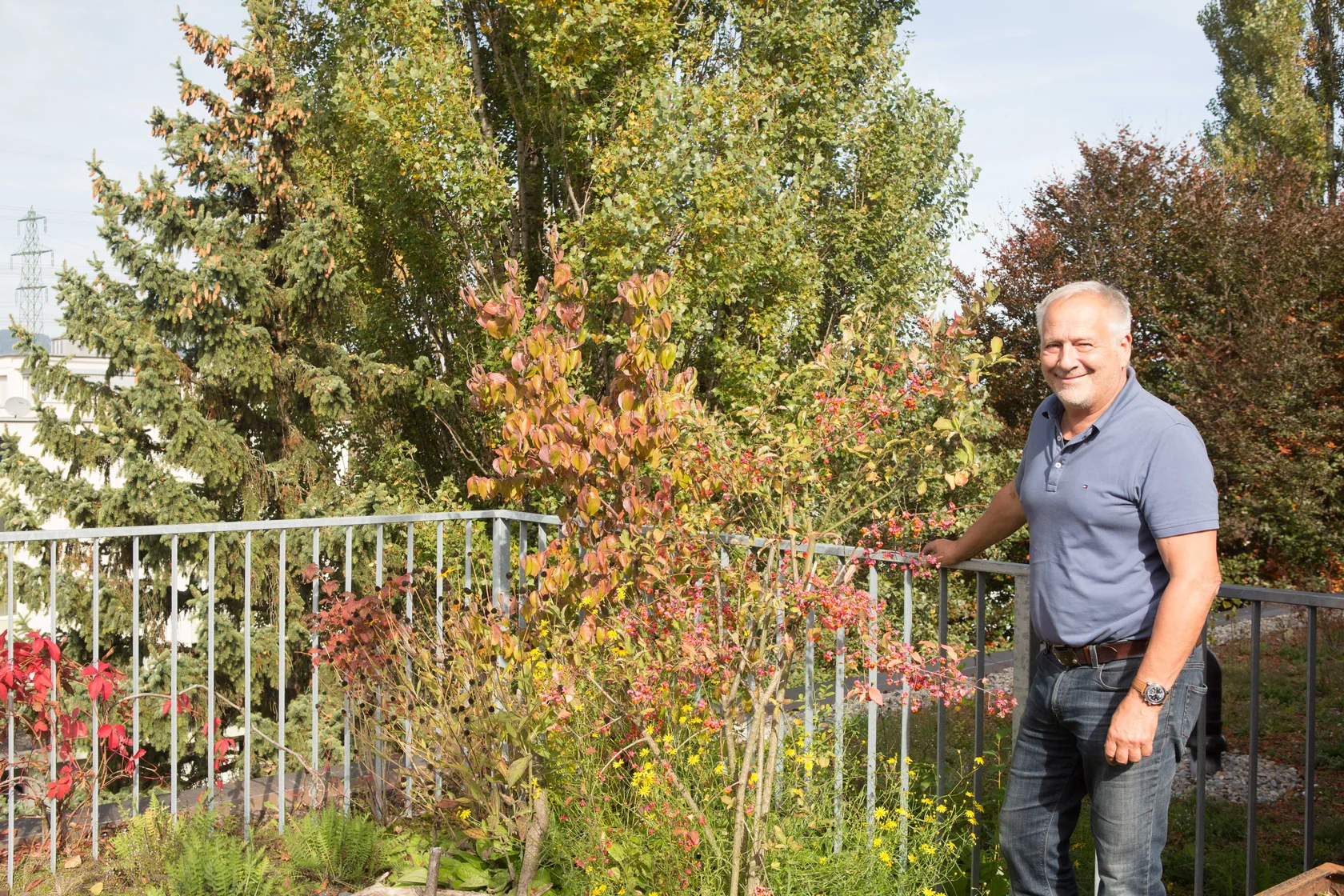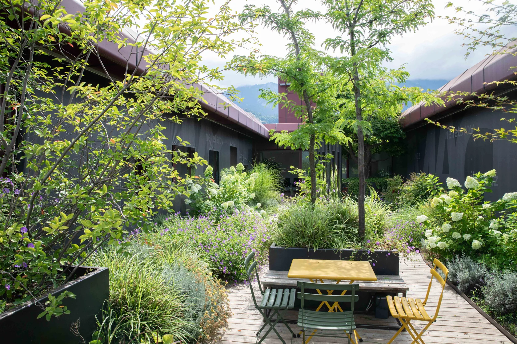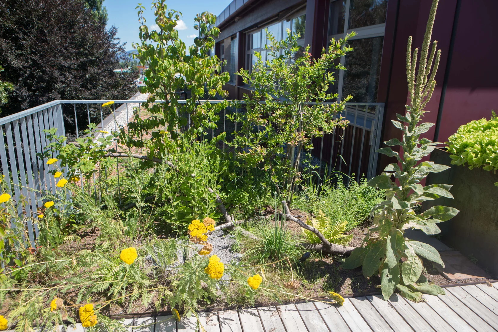 Die Natur-Terrasse wird sehr naturnah angelegt. Mit heimischen Pflanzen, Totholz am Boden, Wildbienenflächen, Farne und Bodendecker, sowie mit Rankpflanzen an Seilbespannungen und verrostenden Baumbehältern. Zwei Hochbeete für die Bepflanzung durch Mitarbeiter. Beschattende Bänke zum Rasten und Erholen laden die Besucher zum Naturgenuss ein. Mit Blick auf die Abendsonne weit drüben über den Schweizer Bergen.